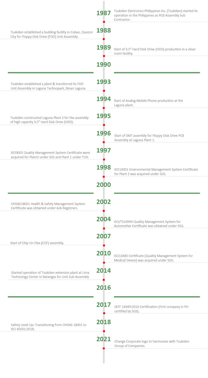 “Tsukiden Electronics Philippines, Inc. has been in the Electronic Manufacturing Service for more than thirty (30) years. Incorporated in March 1992, as a wholly owned subsidiary of Tsukiden Kogyo Co., Ltd. of Japan.